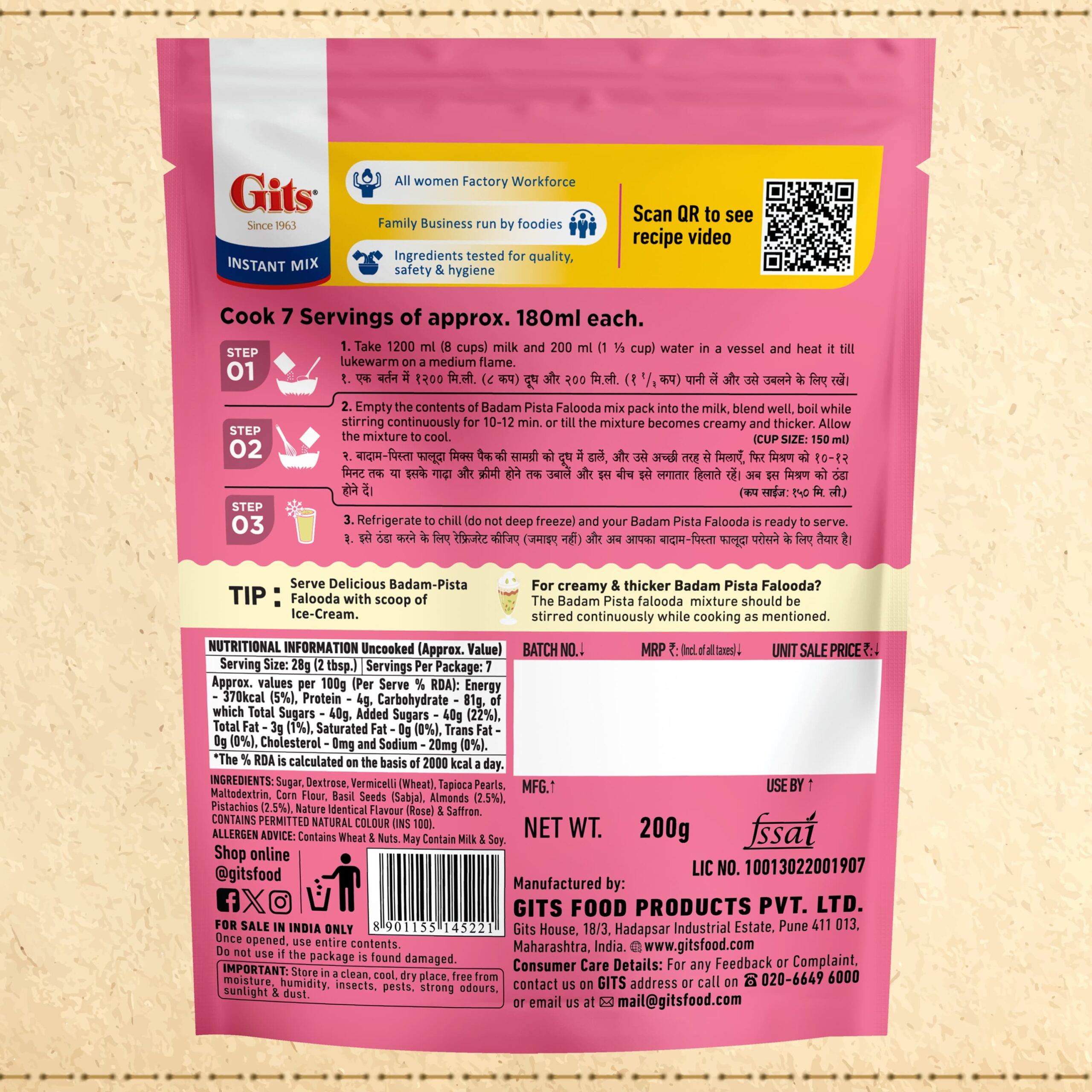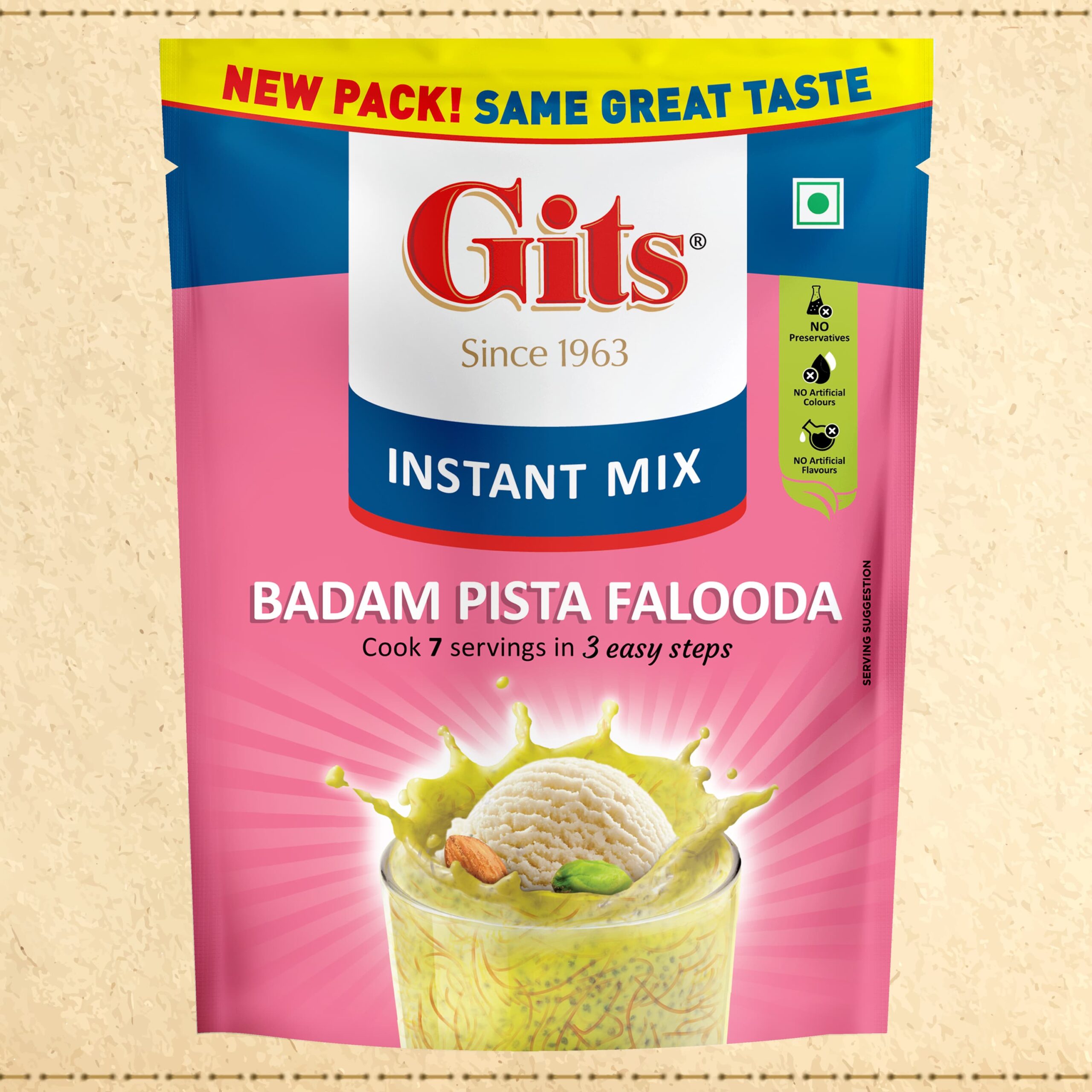 Gits Badam Pista Drink Mix has an earthy nutty flavor that is relished by most households in India. The mix has vermicelli, sweet basil (sabja) seeds, and crushed almonds & pistachios giving it a creamy consistency and great texture. Real saffron is also added for enhanced the taste and aroma.