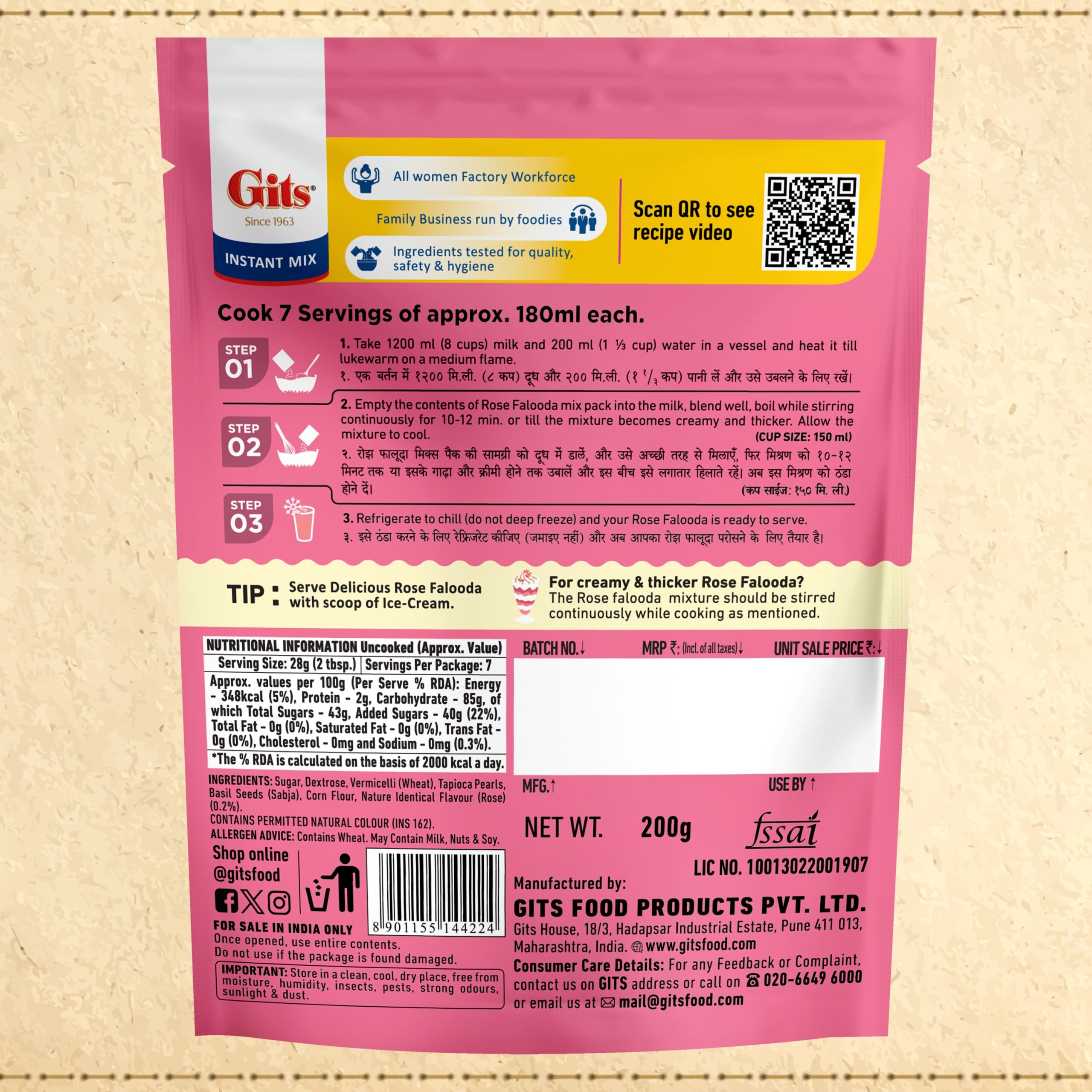 Gits Rose Falooda Mix is one-of-a-kind delicious drink to beat the heat! One of the most loved drink mixes, our rose falooda mix is known to have an amazing texture and creamy consistency. The mix includes rose flavour, vermicelli and basil (sabja) seeds.
